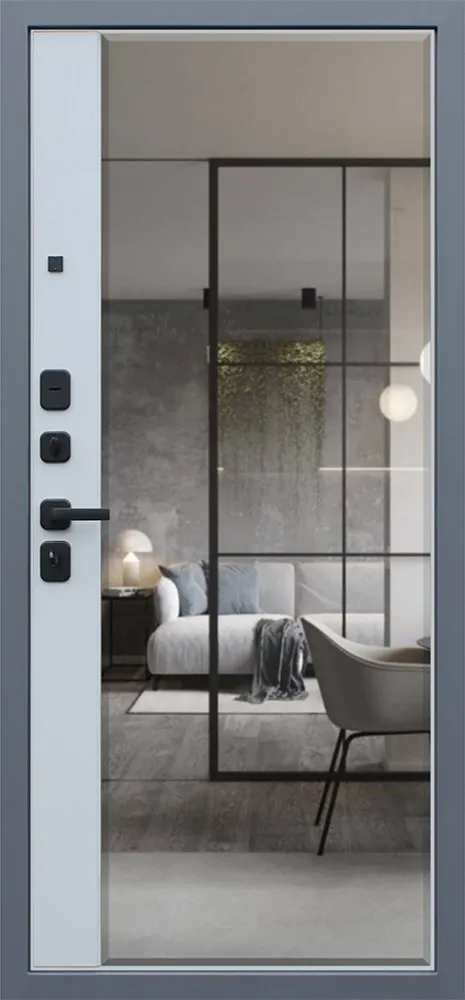 Порошковое покрытие Муар Серый Экошпонированная панель МДФ 10 мм (дизайн ФЛС). Цвет "ясень графит". Объемная фрезеровка. Вертикальная вставка из черного глянцевого лакобеля. Наличник МДФ 80 мм.