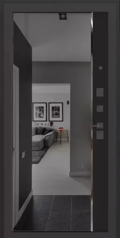 Фурнитура в черном цвете: накладка со шторкой, глазок , дверная ручка, ночная задвижка. Цилиндр ключ-вертушка (производитель не регламентируется), регулируемый эксцентрик.